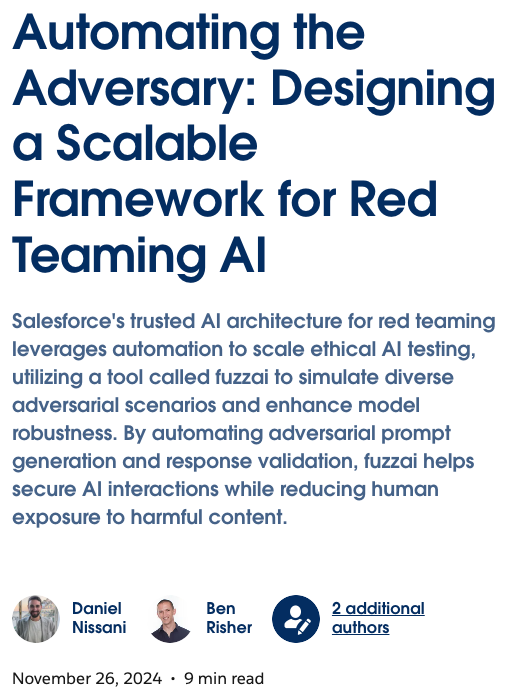 Salesforce Blog: Automating the Adversary: Designing a Scalable Framework for Red Teaming AI ✅ Read the blog: Desigining a Scalable Framework for Red Teaming AI