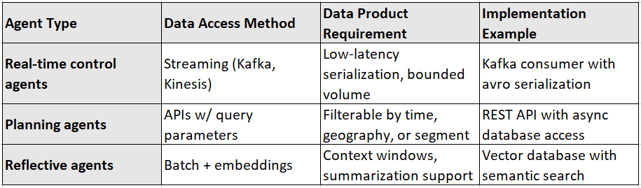 Agents operate on different decision time horizons. Some react in milliseconds, others in minutes. Data products must match this operational cadence via appropriate interfaces. In the table below I have mapped out the different types of AI agents to the data access methods they use, the data product requirements they depend on, and example implementations. It shows you how real-time, planning, and reflective agents need different data architectures to function effectively.