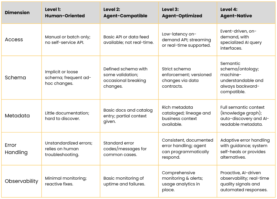 Table 2: Agent-Ready Data Product Maturity Rubric. Use this to score each dimension from 1 to 4. A truly agent-ready (Level 4) data product would score 4’s across the board. More likely, you’ll see a mix – which is fine, it highlights areas for improvement.