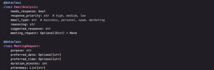 Instead of juggling messy dictionaries, we create clean, typed data structures. This makes our code more reliable and easier to debug. Each `EmailAnalysis` object contains everything our agent learned about an email - like a detailed report card.