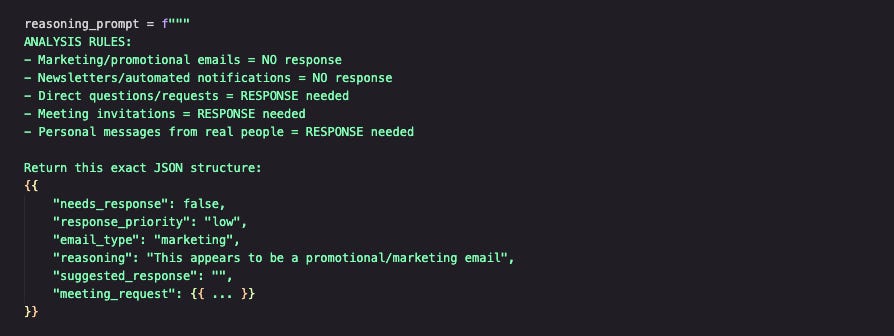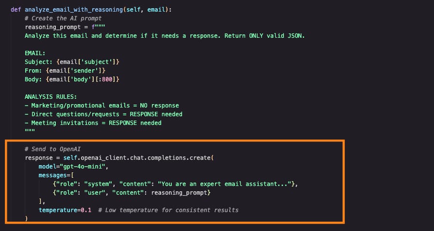 The heart of our agent lies in the `analyze_email_with_reasoning()` method. Here's where the magic happens: