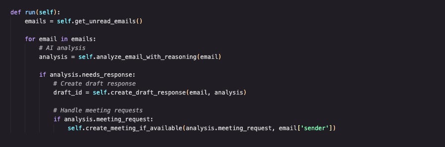 method, our agent’s orchestrator. It implements a simple but powerful perception–reasoning–action loop. Despite the complexity under the hood, the main workflow is clean and understandable. Fetch emails → Analyze with AI → Take appropriate action, that’s it.