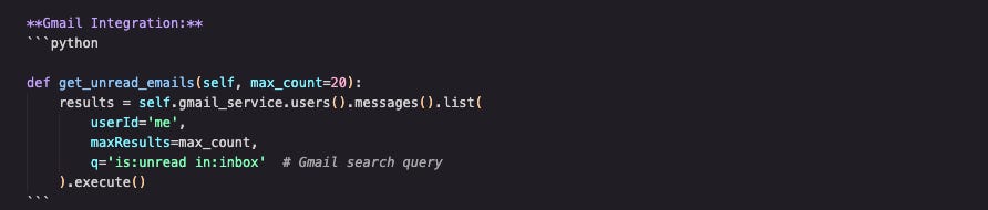 function leverages the Gmail API to fetch unread emails from the user's inbox. Here's what each part does: