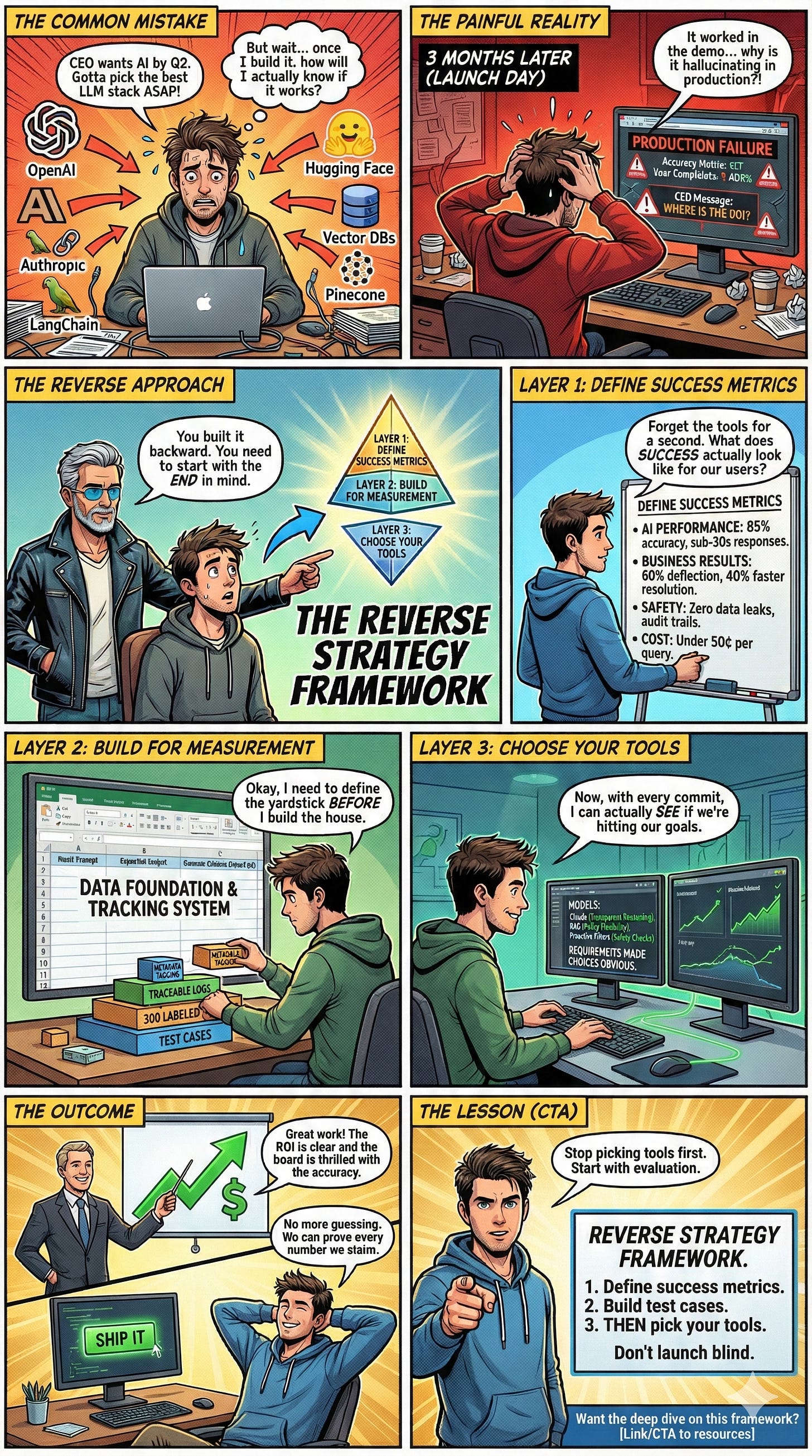 The most successful AI implementations I’ve seen follow what I call the Reverse Strategy Framework. Instead of rushing to pick models and frameworks, they start by figuring out how to measure success, design systems to capture those measurements, and only then choose their tools.