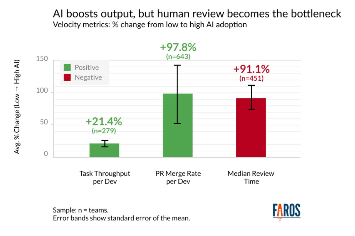Why? Bottlenecks. Teams with high AI adoption complete 21% more tasks but PR review time increases 91%. You’re just moving the constraint.