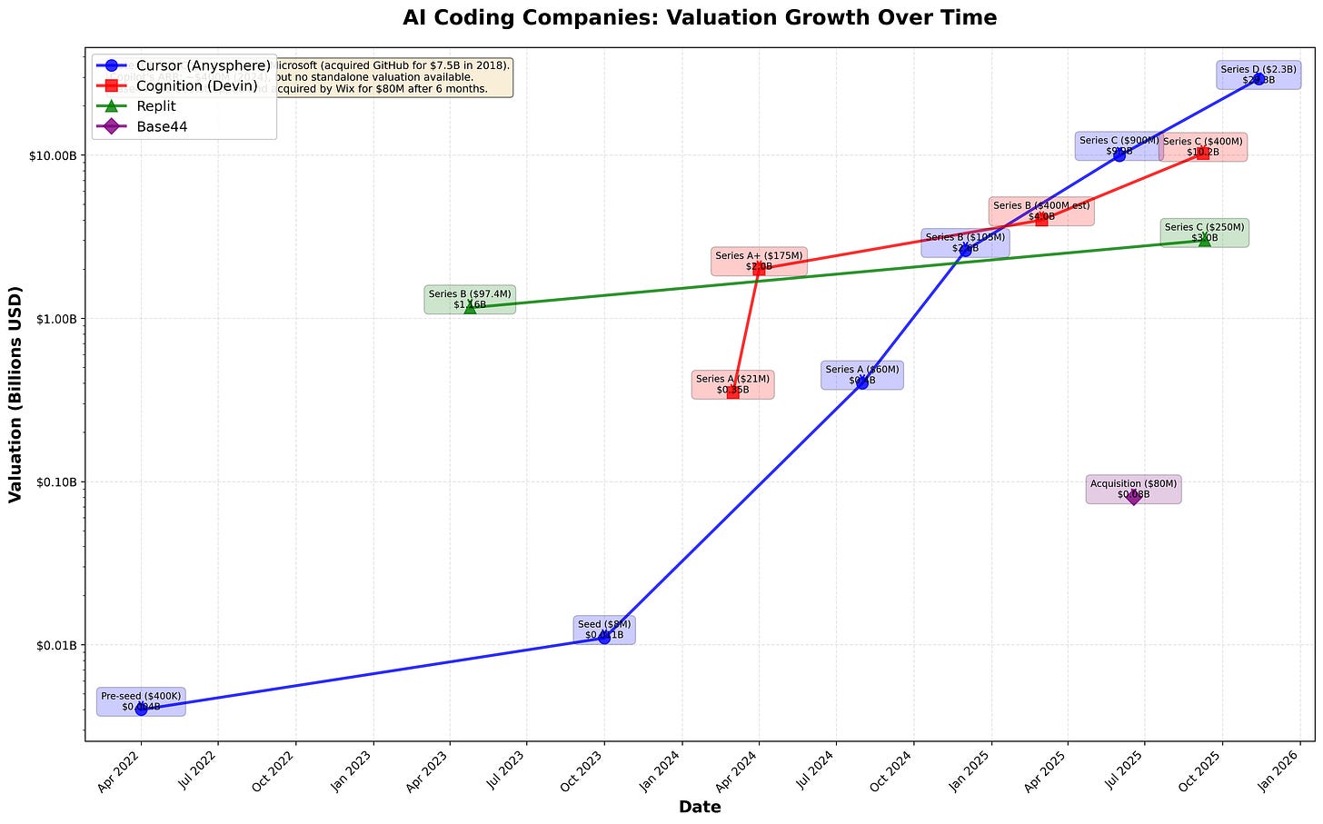 Let’s talk about the business of coding agents first. Cursor hit $1B ARR in just 24 months - the fastest any SaaS company has ever scaled. This is insane. Cognition AI (maker of Devin) is now valued at $10.2 billion. GitHub Copilot generates around $400M in annual recurring revenue. There’s real money being made here.