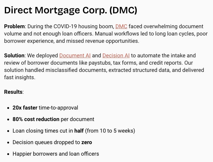 Direct Mortgage Corp’s new AI agents now handle loan paperwork automatically, sorting and extracting the right info from hundreds of file types - even when they’re mislabeled. With this upgrade, approvals happen 20x faster, costs drop by 80%, and closing times are cut in half. This smart automation means quicker decisions, happy borrowers, and a smoother mortgage experience for everyone.